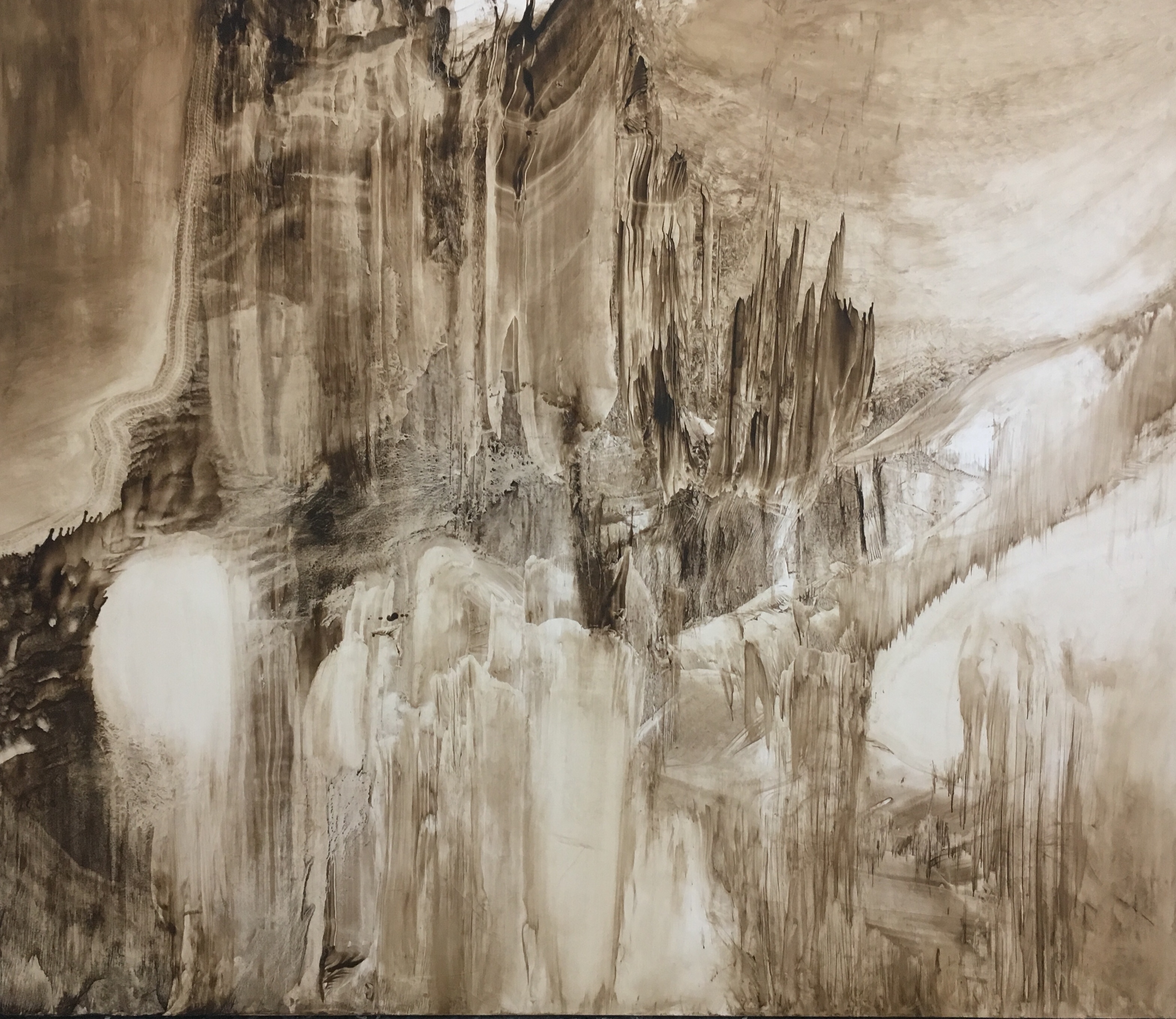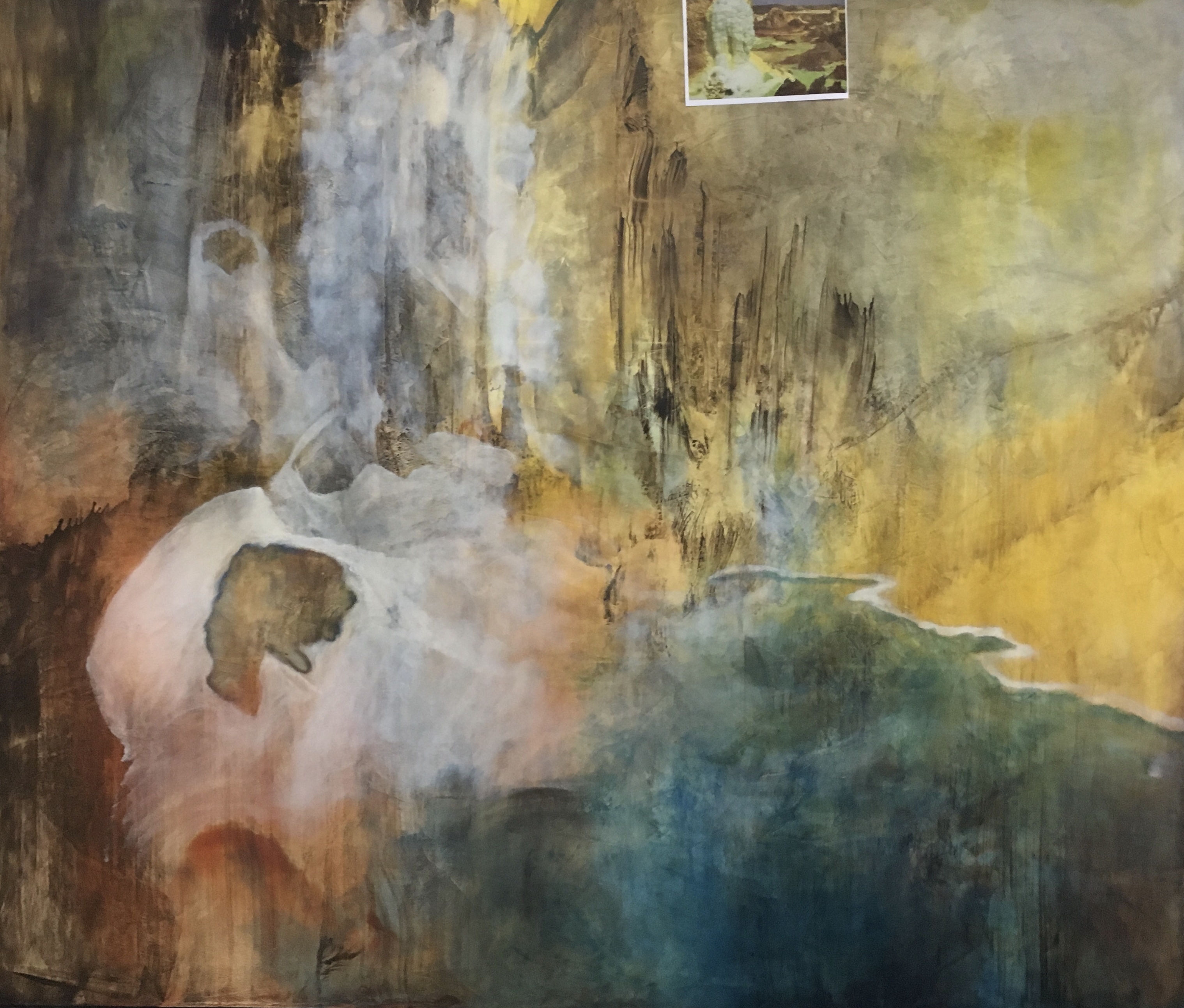 I decided to reintroduce some light into the painting to prevent it from getting dark and dirty too early. This I did by with a brush and hand in order to get an even surface and also to work off what is there in the image already. For structural reference I extracted from pictures of an acid desert in Ethiopia – The terrain is otherworldly. I am very much looking forward to seeing how the journey of this painting will go and of course where it will end up!