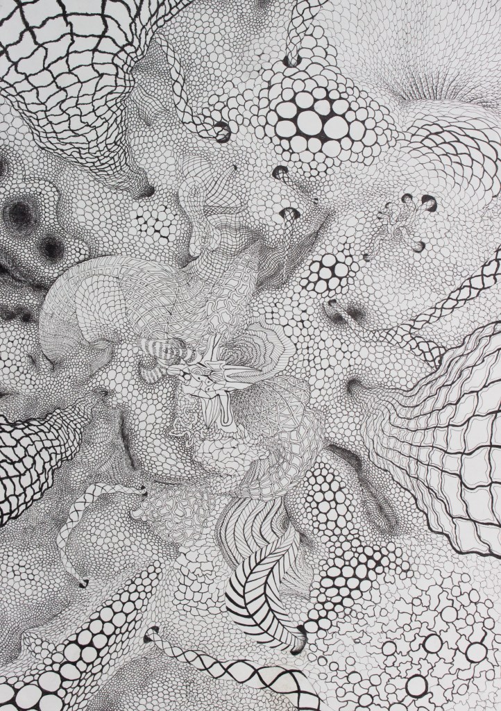 When I used to doodle I would often unfocus my eyes and stare at one spot the whole time. The rest of the drawing would emerge from my periphery but more importantly would be a result of my awareness of what my hand is doing and where it is going, rather than what my eyes dictate is happening. It’s about treading a fine line of perfection, usually falling far from the mark but having the knowledge of when you’ve hit it.