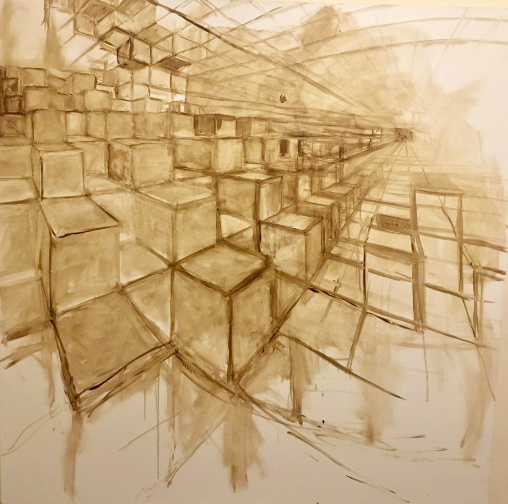 I hope in this work that I shall pool together some of my knowledge of architectural design and my knowledge of the more expressive arts. Using this three-dimensional grid I intend to use this as a method for my imagination entering the image with ease. I imagine this painting will end up somewhat illustrative. Initially what drew me to large scale drawings was about how much I could put into the image. I often used Sharpies which don’t have a particularly fine point but their bulkiness was appealing to the way I draw. Detail has always been an obsession of mine and the most logical way to gain detail was to increase scale. As I have increased my knowledge of 2D image making I have realised this is not absolutely necessary. I have achieved more detail on an even smaller scale now.