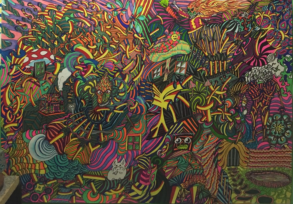 After looking at old colourful drawings I felt inspired to pick up a brush again and return once again to drawing but this time it will be with paint but this time I will have a lot more experience and confidence to carry my through. In the past I remember dreaming of painting large versions of my colourful drawings. My first attempt at this resulted in near instant failure. I had attempted to literally transpose one of my favourite pen drawings onto a canvas over twice the size. In just a few sessions I realised a few things. One was that for me there was absolutely no point in doing this chore – the image already existed and it served no purpose to replicate it in paint. What I really wanted to do is paint with the same gestural subconscious flow as I could with pens. Every aspect of my knowledge of paint was inadequate so I soon gave, instead I planned to return when I had a better grasp of painting.