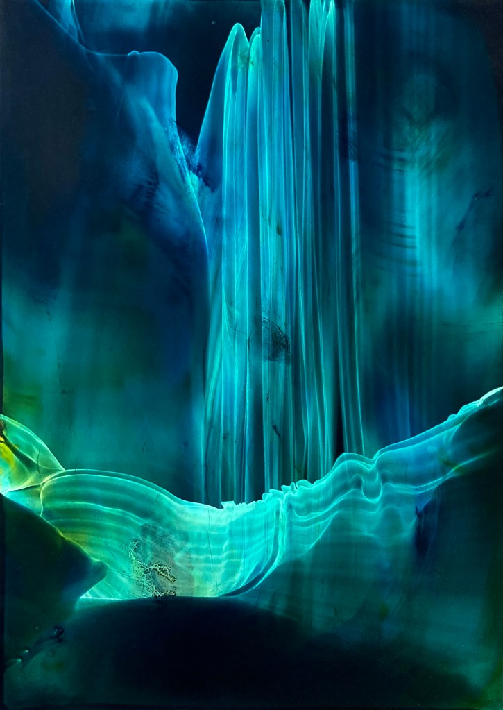 The work is a potent blend of hyperrealism and abstraction. With vivid saturated colours, flowing lines, deep shadows, unidentifiable sources of light and the deliberate absence of context or sense of scale, he creates visions that are ambiguous. Images might have their genesis in the vastness of empty skies or in moments of enclosure and intimacy. Subatomic, intracellular or cosmic, they become transmissions from putative alien worlds or secret inner worlds. Open to simultaneous, contradictory currents of interpretation.